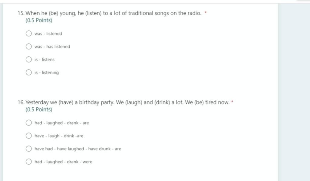 15. was-listened ( câu này phải dựa vào nghĩa của câu)