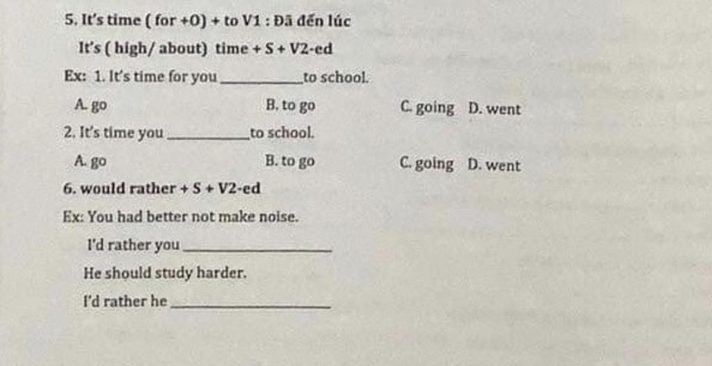 - It's time + S + V2/ed: Đã đến lúc ai đó làm gì