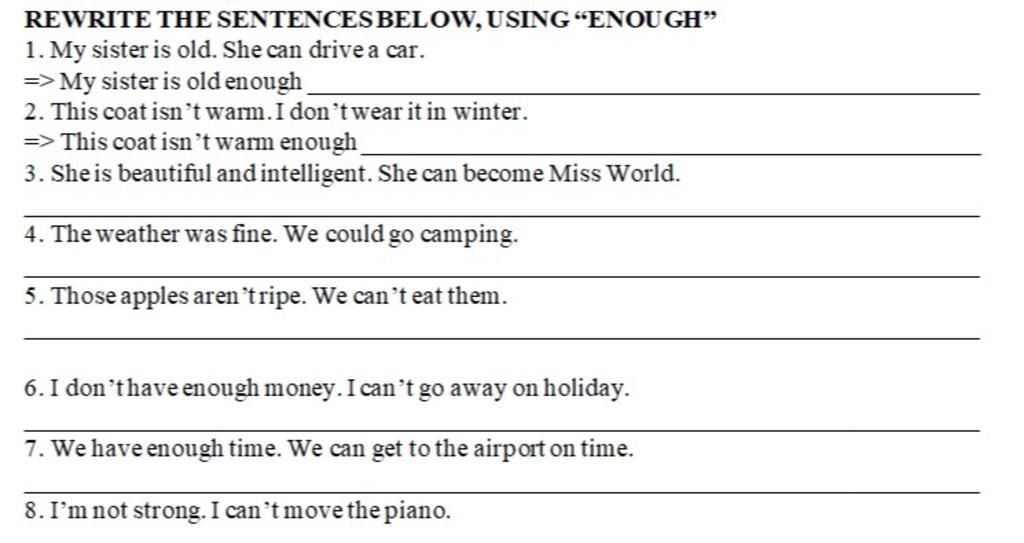 bài bạn dưới : 1. My sister is old enough to drive a car 2. Thus coat isn’t warm enough for me to wear in the winter 3. She is beautiful and intelligent enough to become Miss World 4. The weather was fine enough for us to go camping 5. Those apples aren’t ripe enough for us to eat them 6. I don’t have enough money to away on holiday 7 we have enough time to get to the airport on time 8. I am not strong enough to move the piano bài bạn : 1. My sister is old enough to drive a car 2. Thus coat isn’t warm enough for me to wear in the winter 3. She is beautiful and intelligent enough to become Miss World 4. The weather was fine enough for us to go camping 5. Those apples aren’t ripe enough for us to eat them 6. I don’t have enough money to away on holiday 7 we have enough time to get to the airport on time 8. I am not strong enough to move the piano Rút gọnbài bạn dưới : 1. My sister is old enough to drive a car 2. Thus coat isn’t warm enough for me to wear in the winter 3. She is beautiful and intelligent enough to become Miss World 4. The weather was fine enough for us to go camping 5. Those apples are... xem thêm