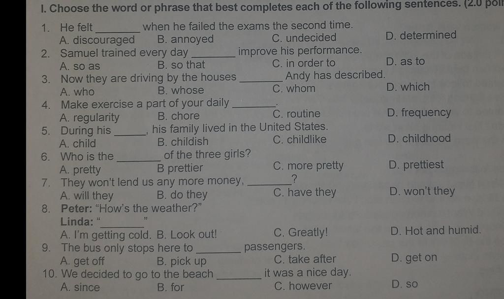 I. Choose the word or phrase that best completes each of the following sentences. (2.0 pól