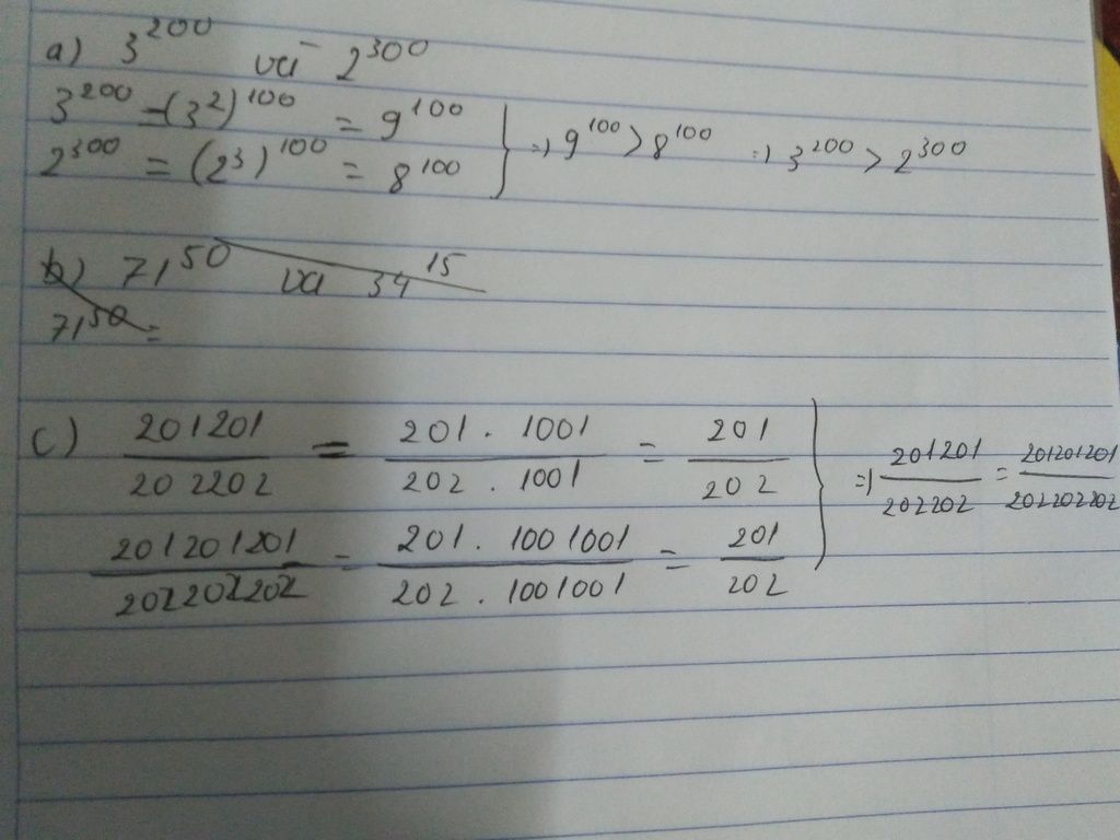$a) 3^{200}>2^{300} \\ b) 71^{50} > 34^{15}\\ c) \dfrac{201201}{202202} = \dfrac{201201201}{20202202}.$