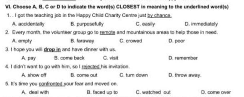 VI. Choose A, B, C or D to indicate the word(s) CLOSEST in meaning to the underlined word(s)