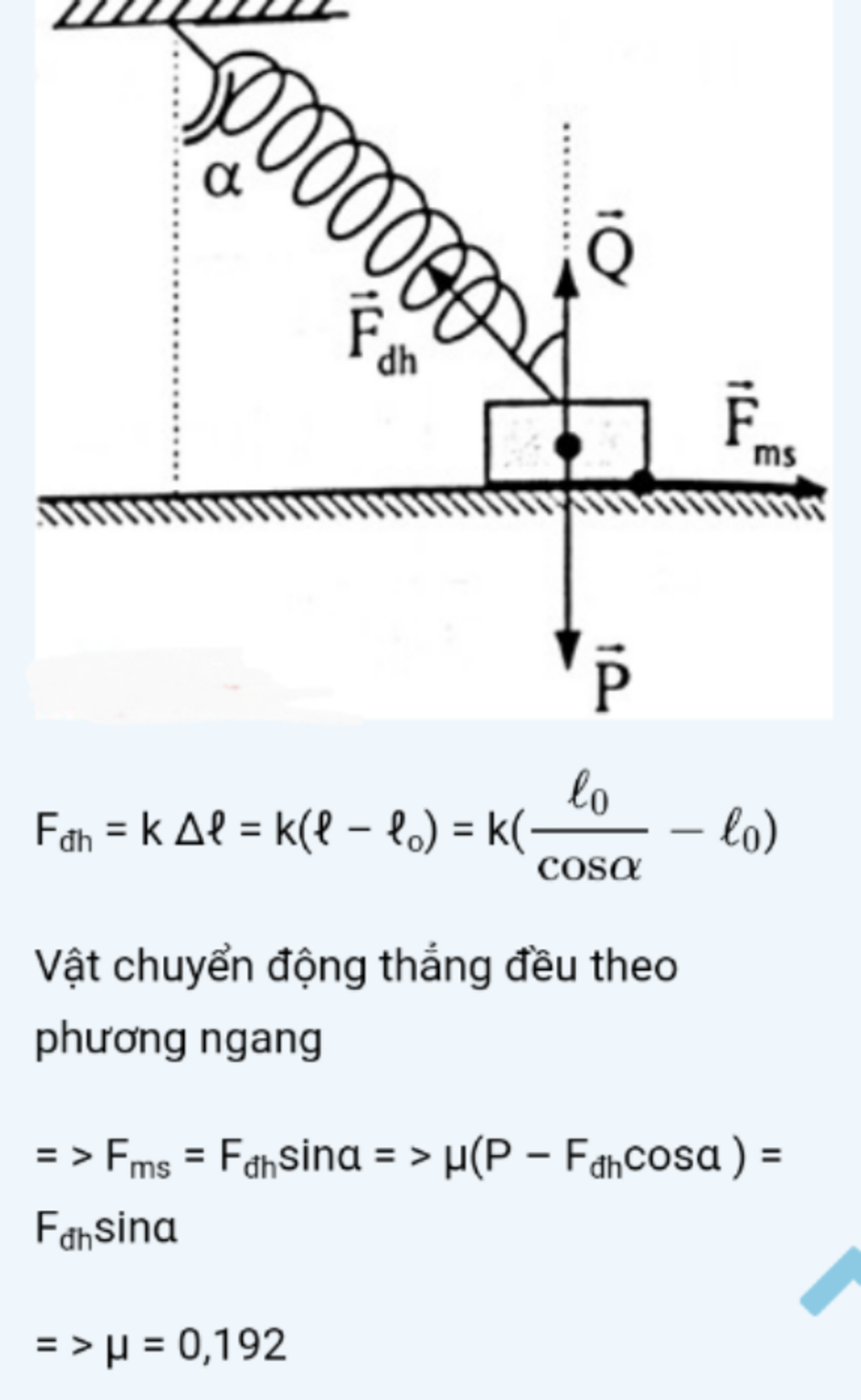 một lò xo có độ cứng k=10N/m, đặt thẳng đứng, một đầu nối với 1 vật m=0,5kg nằm trên mặt bàn nằm ngang. Đầu kia của lò xo được giữ chặt ở phía trên ở độ cao Lo=0,1m. ở vị trí này lò xo không bị biến dạng. cho bàn chuyển động đều theo phương ngang, lò xo bị lệch đi 1 góc 60 đọ khỏi phương thẳng đứng. tìm hệ số ma sát trượt giữa vật và bàn.