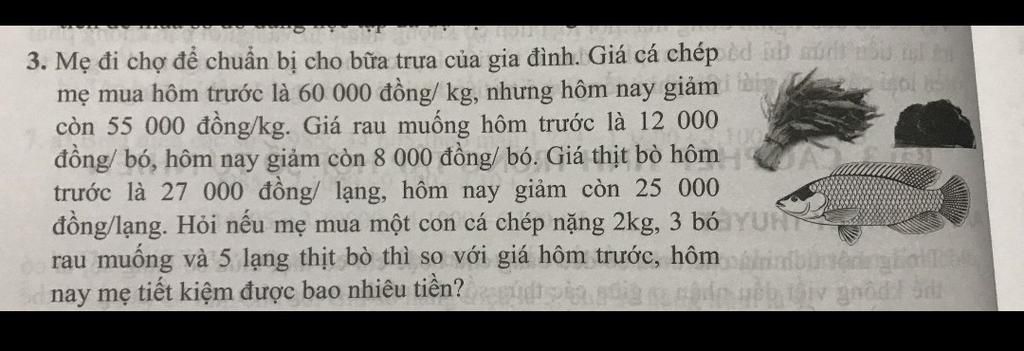 Nếu hôm nay mẹ mua một con cá chép 2kg, 3 bó rau muống và 5 lạng thịt bò thì tiết kiệm đc là: