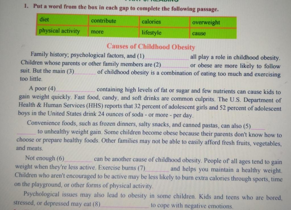 Not enough (6) physical activity can be another cause of childhood obesity . People of all ages tend to gain weight when they're less active . Exercise burns (7) calories and helps you maintain a healthy weight . Children who aren't encouraged to be active may be less likely to burn extra calories through sports , time on the playground , or other forms of physical activity .
