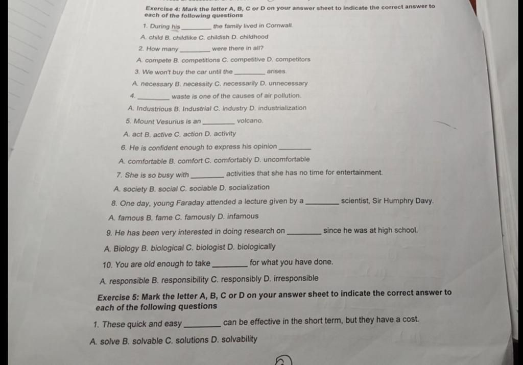 se 4: Mark the letter A, B, C or D on your answer sheet to indicate the correct answer to