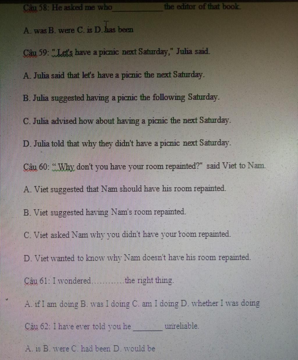 61. D câu tường thuật dạng Yes/No questions : asked sb/wondered if/whether S V(lùi thì, HTTD -> QKTD)