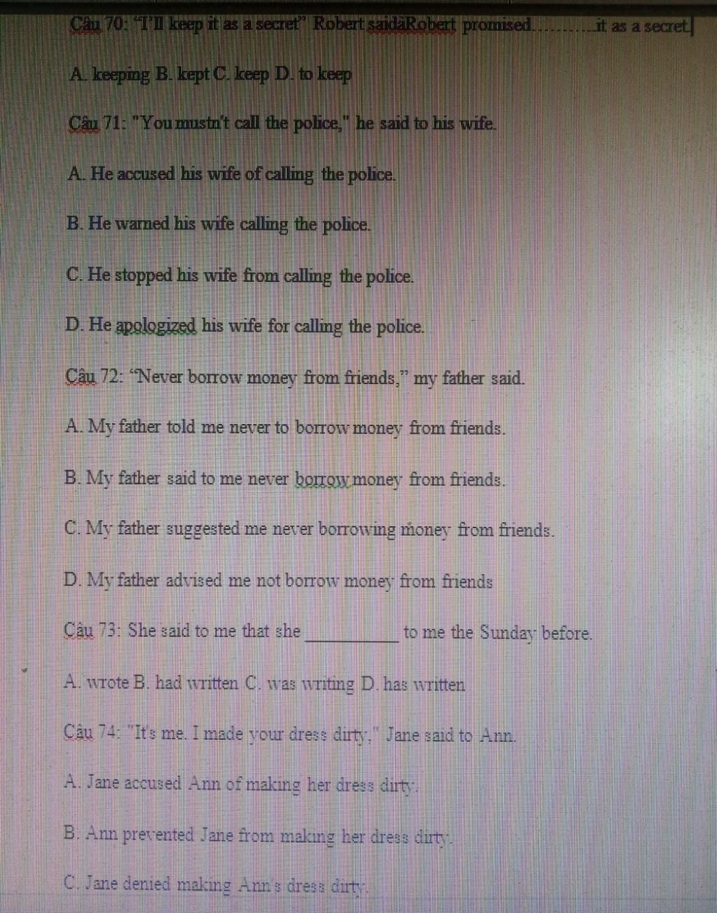 72. D (advise s.one (not) to do ds.th: khuyên ai (không) làm gì)