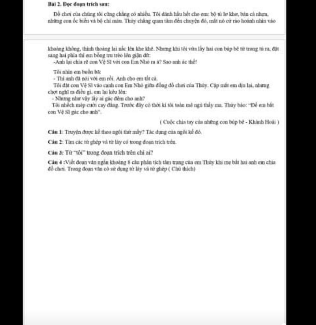 `-` Từ ghép : Đồ chơi, cho em, cá nhựa, ốc biển, chì màu, con búp bê, giận dữ, chia rẽ, cặp mắt, kêu lên, gác đêm, nhếch mép, cay đắng, mơ ngủ, thấy ma