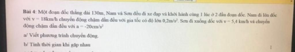Chọn gốc tọa độ tại đỉnh dốc, chiều dương hướng xuống chân dốc, gốc thời gian lúc hai bạn xuất phát. Phương trình chuyển động của hai bạn Nam và Sơn lần lượt là: