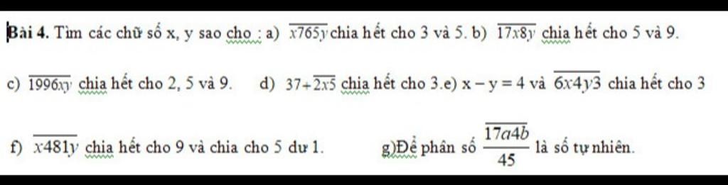 e) x=9; y=5 ⇒ 69453 chia hết cho 3 và thỏa mãn điều kiện x-y=4