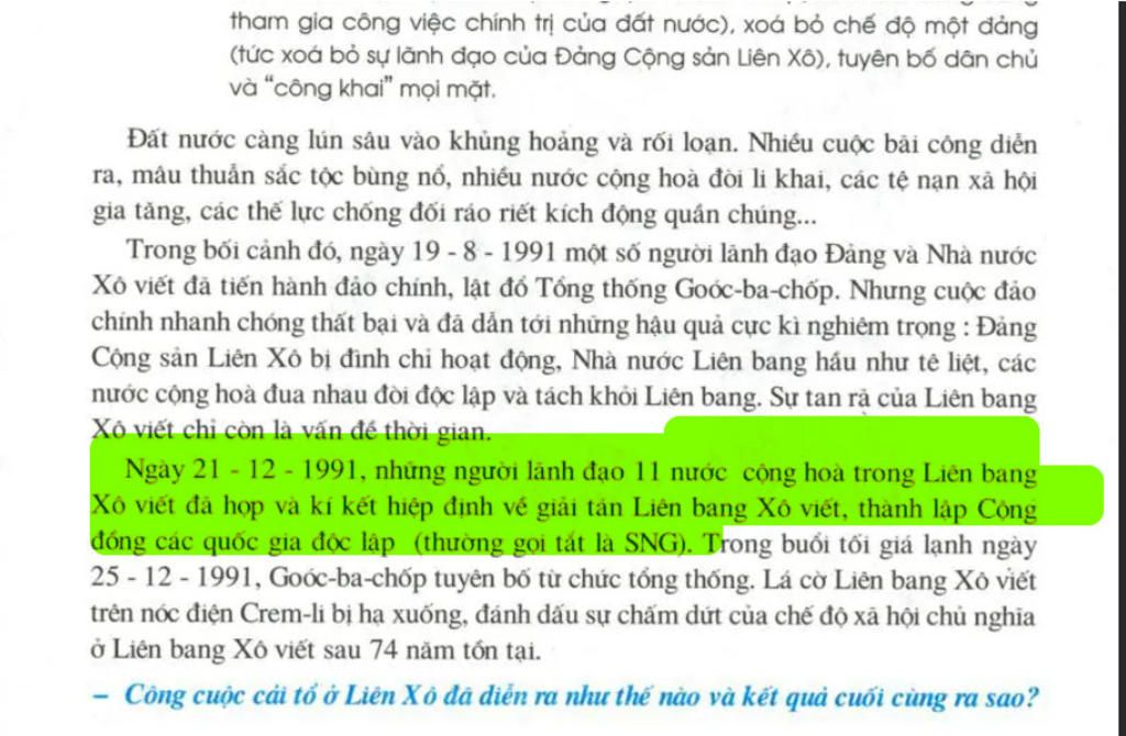 `=>` Ngày `21/12/1991` `11` nước Cộng hòa trong Liên Xô viết đã kí hiệp định và thành lập cộng đồng các quốc gia độc lập (SNG)