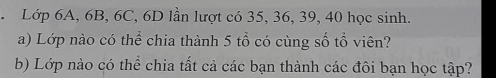 b) Vì lớp 6B và lớp 6D lần lượt có 36 và 40 học sinh đều là số chẵn nên chi hết cho 2 nên có thể chia tất cả các bạn thành các đôi bạn học tập