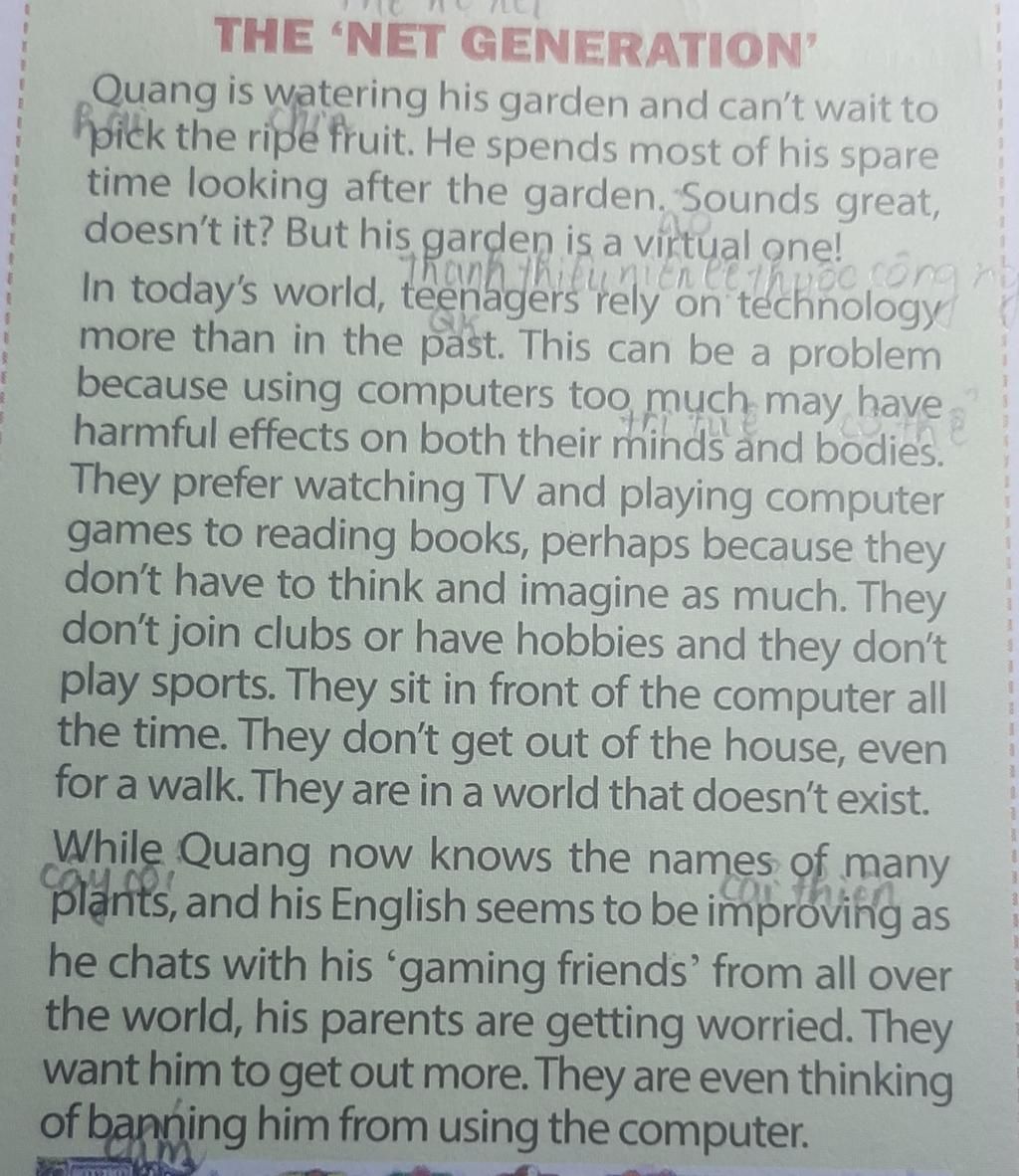 Quang is watering his garden and can't wait to pick the ripe fruit. He spends most of his spare time looking after the garden. Sounds great, doesn't it? But his garden is a virtual one! In today's world, teenagers rely on technology more than in the past. This can be a problem because using computers too much may have harmful effects on both their minds and bodies. They prefer watching TV and playing computer games to reading books, perhaps because they don't have to think and imagine as much. They don't join clubs or have hobbies and they don't play sports. They sit in front of the computer all the time. They don't get out of the house, even for a walk. They are in a world that doesn't exist. While Quang now knows the names of many plants, and his English seems to be improving as he chats with his 'gaming friends' from all over the world, his parents are getting worried. They want him to get out more. They are even thinking of banning him from using the computer.
