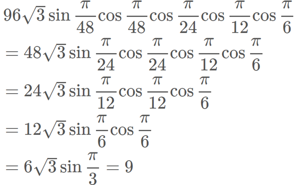 $\begin{align} & \,96\sqrt{3}\sin \dfrac{\pi }{48}\cos \dfrac{\pi }{48}\cos \dfrac{\pi }{24}\cos \dfrac{\pi }{12}\cos \dfrac{\pi }{6} \\ & =48\sqrt{3}\sin \dfrac{\pi }{24}\cos \dfrac{\pi }{24}\cos \dfrac{\pi }{12}\cos \dfrac{\pi }{6} \\ & =24\sqrt{3}\sin \dfrac{\pi }{12}\cos \dfrac{\pi }{12}\cos \dfrac{\pi }{6} \\ & =12\sqrt{3}\sin \dfrac{\pi }{6}\cos \dfrac{\pi }{6} \\ & =6\sqrt{3}\sin \dfrac{\pi }{3}=9 \\ \end{align}$