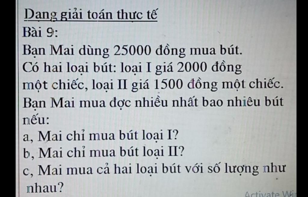 c, Nếu mua 2 loại cùng số lượng mua đc : 25000:(2000+1500)=3 (đây là 3 quyển mỗi loại nha, và dư 1500 )