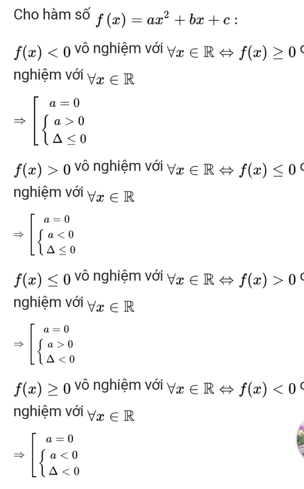 Điều kiện để bất phương trình bậc 2 vô nghiệm: