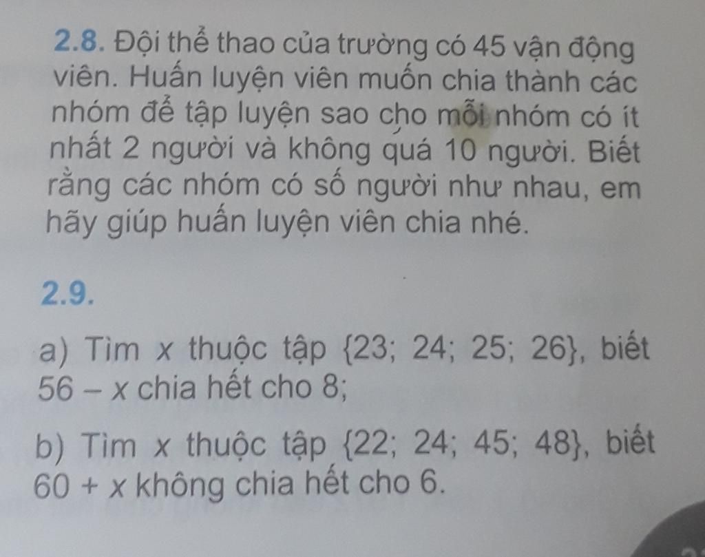 Vì đội thể thao của trường có 45 vận động viên và huấn luyện viên chia thành các nhóm mà mỗi nhóm có số người như nhau nên 45 ⁝ x hay x ∈ Ư(45)