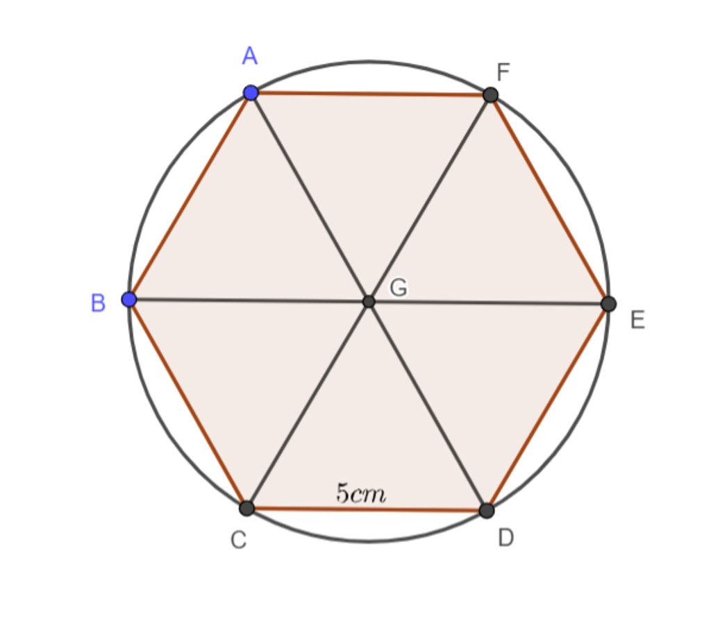 Diện tích hình tròn ngoại tiếp lục giác đều cạnh 5cm là $25πcm^2$