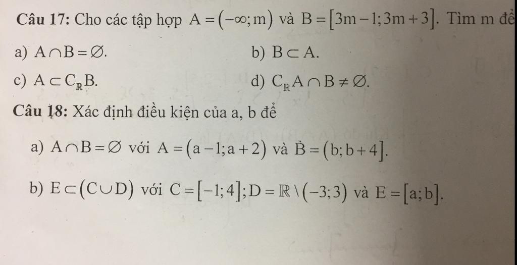 Câu 17: Cho các tập hợp A = (-;m) và B= [3m-1;3m +3]. Tim m để