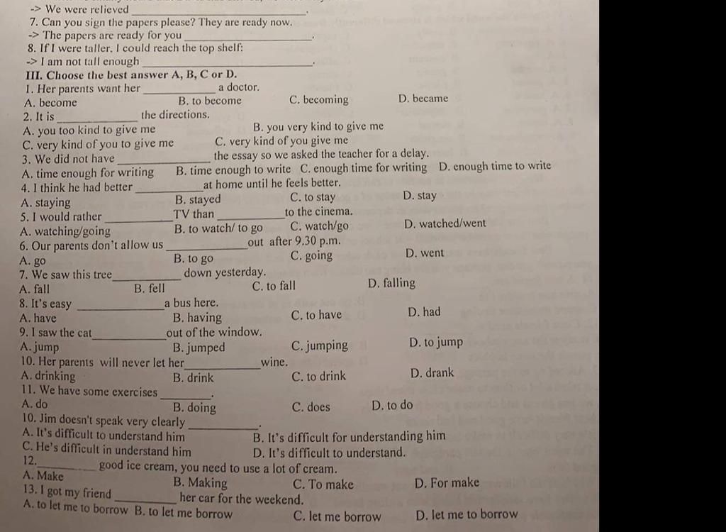 III. Choose the best answer A, B, C or D.