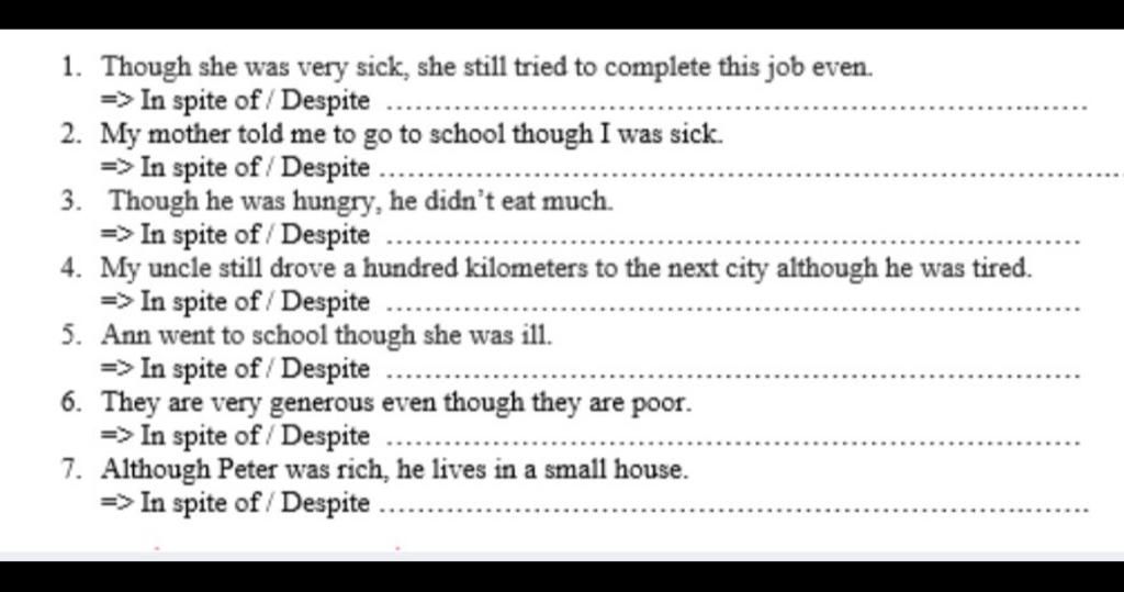 `1.` In spite of / Despite her sickness, she still tried to complete this job even.