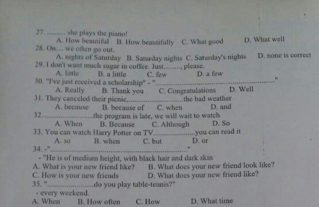 29. B sugar không đếm được, a little là ít nhưng đủ dùng