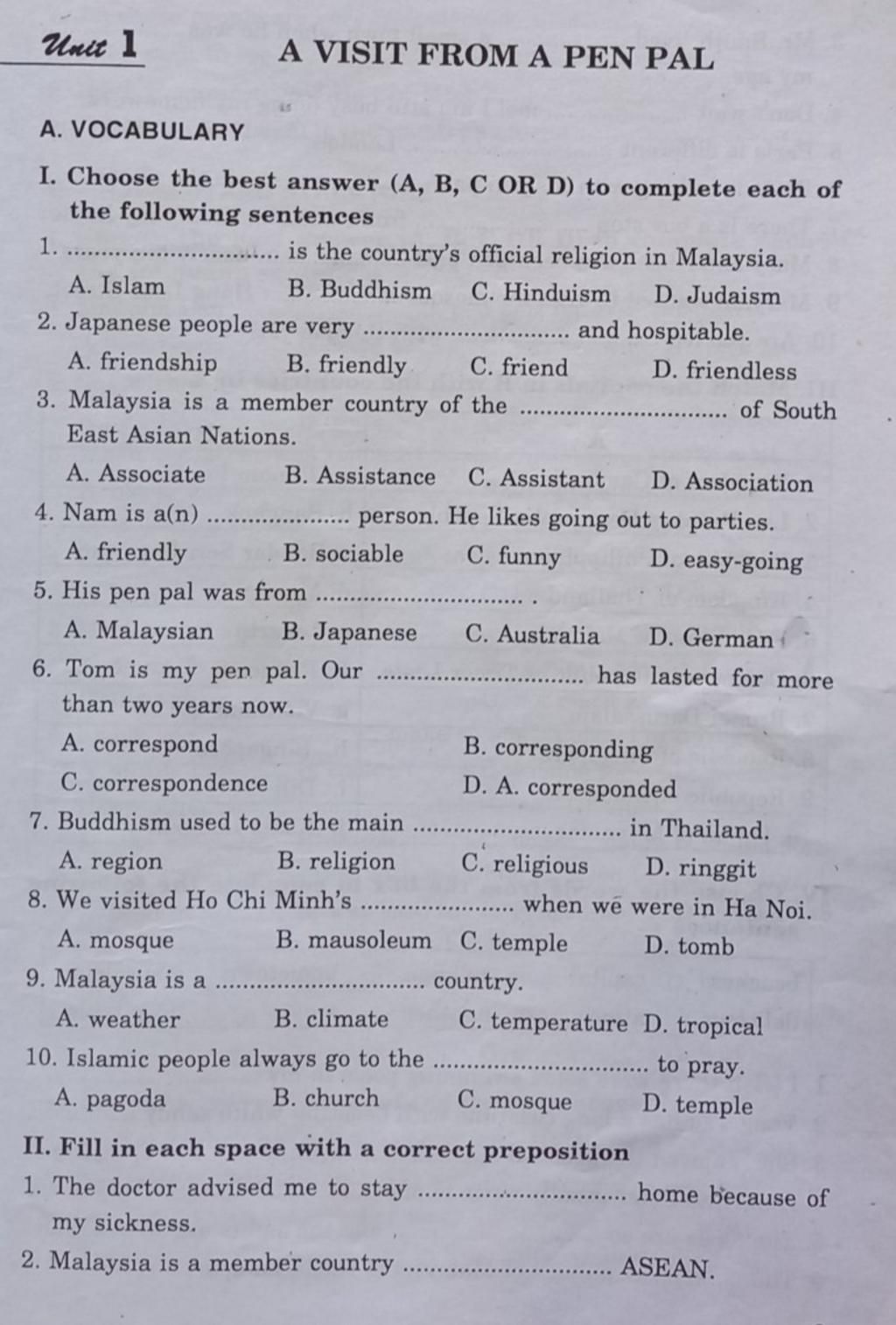 I. Choose the best answer (A, B, C OR D) to complete each of