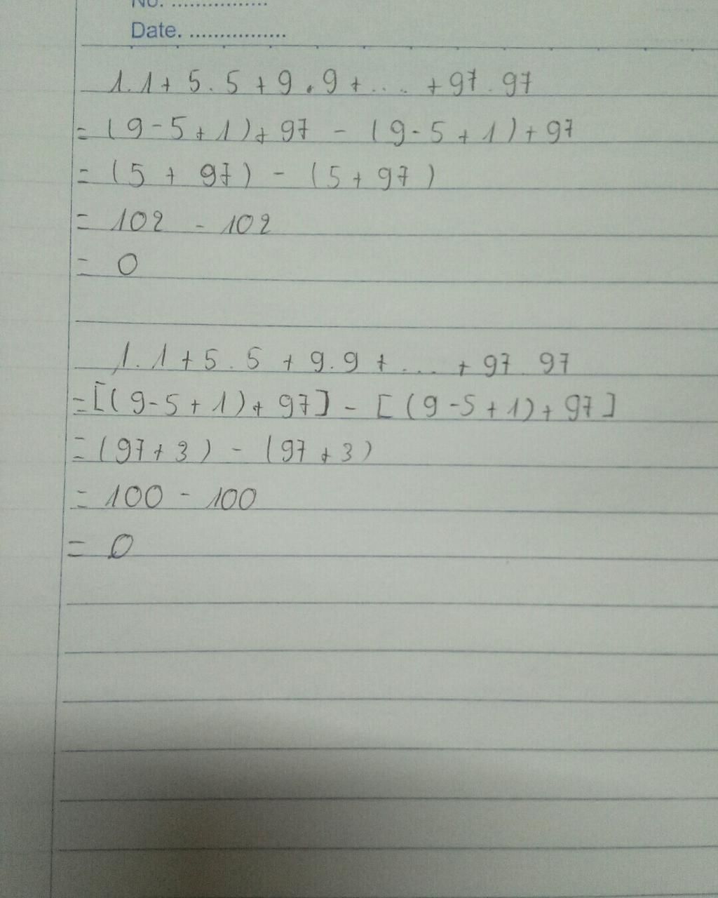 Đáp án:1.1+5.5+9.9+...+97.97[(9-5+1)+97]-[(9-5+1)+97]=(97+3)-(97+3)=100-100=0
