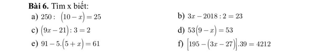 $\text{f) [ 195 - ( 3x - 27 )] . 39 = 4212}$
