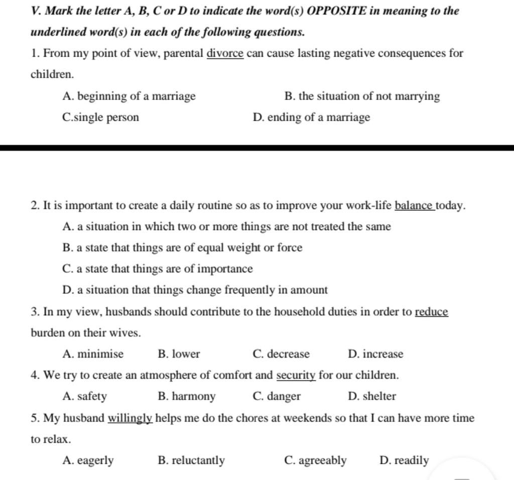 1. Divorce: ly hôn >< beginning of a marriage: bắt đầu cuộc sống hôn nhân -> A
