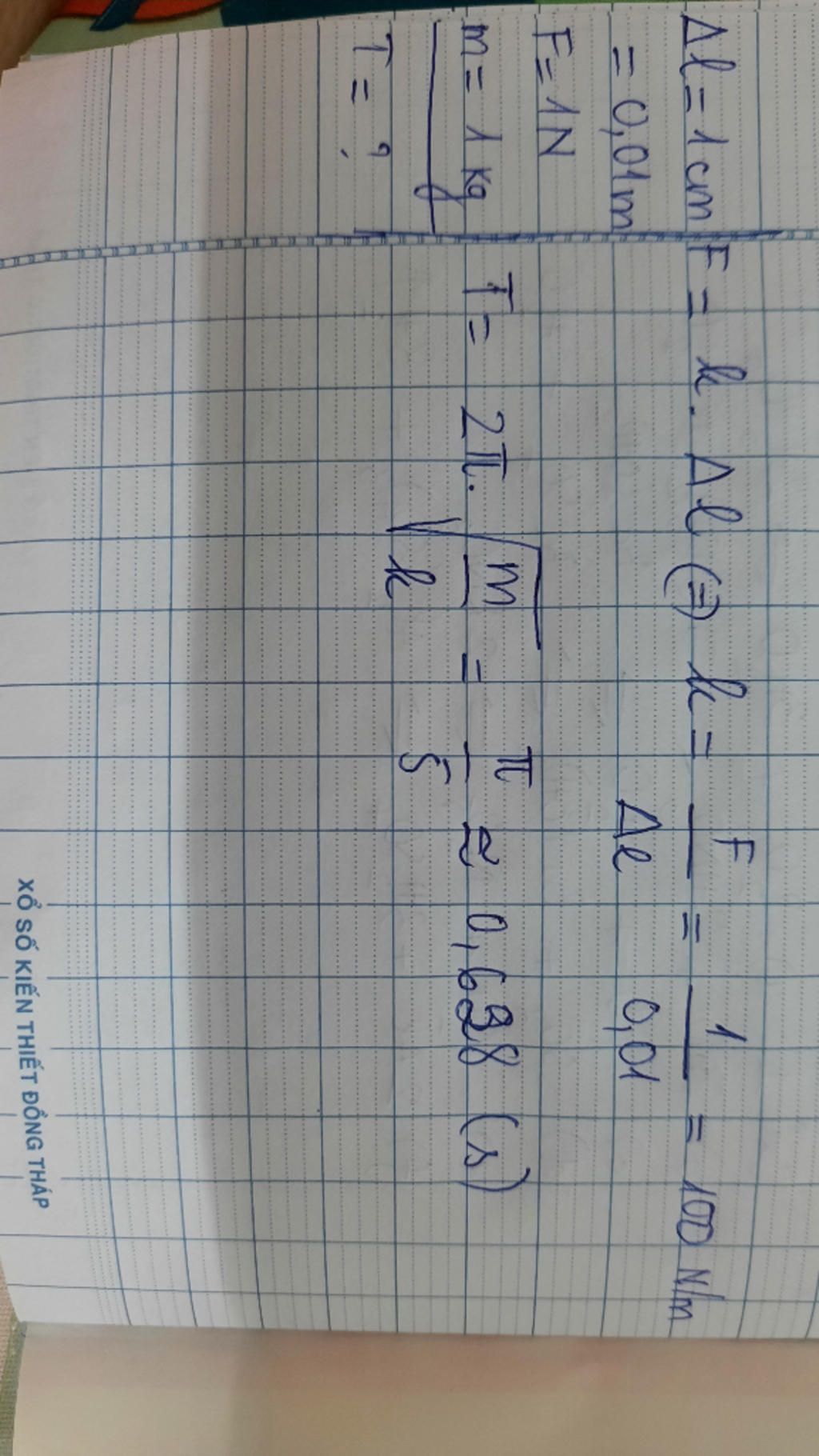 \(k = \dfrac{F}{{\Delta l}} = \dfrac{1}{{0,01}} = 100\left( {N/m} \right)\)