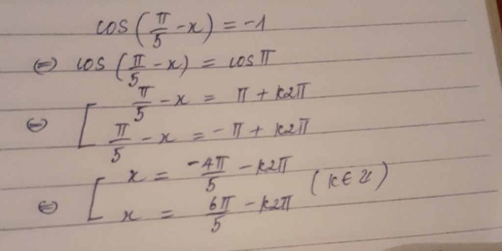 \(\begin{array}{l}\cos \left(\dfrac \pi 5-x\right)=-1\\\Leftrightarrow \left[ \begin{array}{l}\dfrac \pi 5 -x=\pi+k2\pi\\\dfrac \pi 5 -x=-\pi+k2\pi\end{array} \right.\\\Leftrightarrow \left[ \begin{array}{l}x=-\dfrac{4\pi}5+k2\pi\\x=\dfrac{6\pi}5+k2\pi\end{array} \right. \ (k\in \mathbb{Z})\end{array}\)