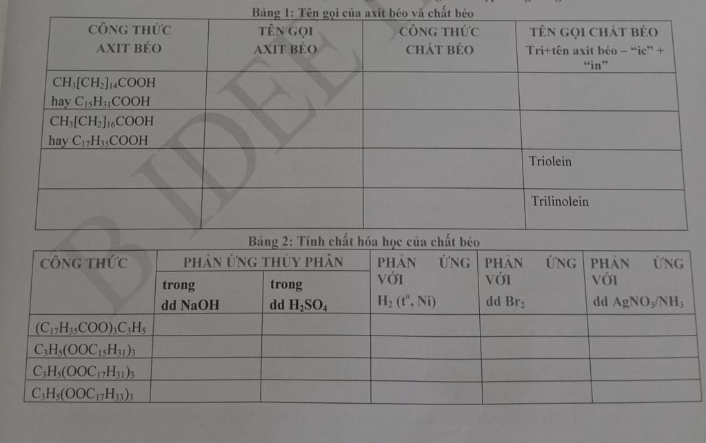Bảng 1: Tên gọi của axit béo và chất béo