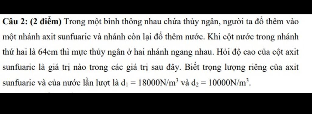 thứ hai là 64cm thì mực thủy ngân ở hai nhánh ngang nhau. Hỏi độ cao của cột axit