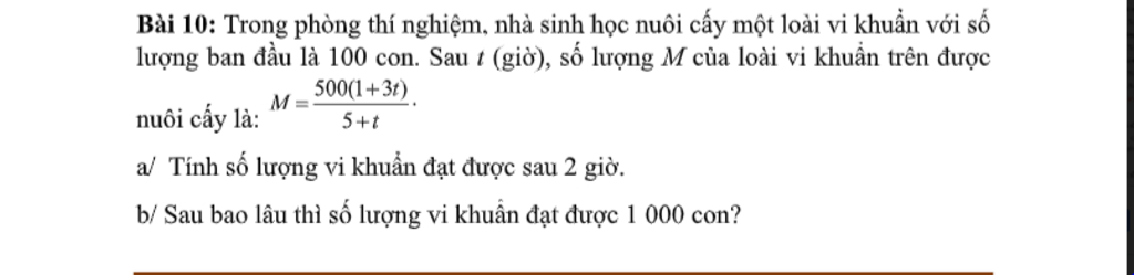 $\to 1000=\dfrac{500(1+3t)}{5+t}\to t=9\to$ sau 9h thì số lượng vi khuẩn đạt được 1000 con