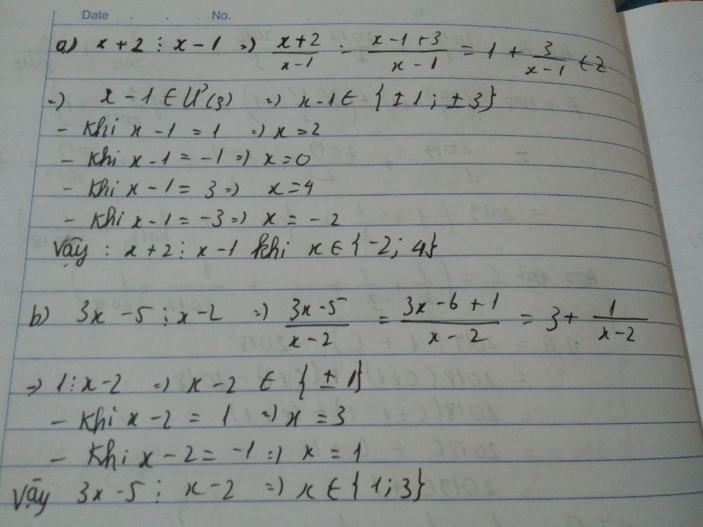 b) Vì 3x - 5 chia hết cho x - 2