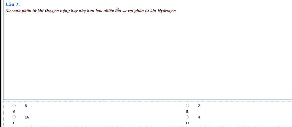Vậy phân tử khí Oxygen nặng hơn 16 lần phân tử khí Hydrogen.