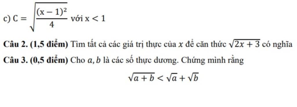 $\displaystyle \begin{array}{{>{\displaystyle}l}} C=\sqrt{\frac{( x-1)^{2}}{4}} \ với\ x< 1\ \\ C=\frac{|x-1|}{2} \ =\frac{1-x}{2} \ ( \ x< 1)\\ Câu\ 2:\ \sqrt{2x+3} \ có\ nghĩa\ khi\ 2x+3\geqslant 0\ \rightarrow x\geqslant \frac{-3}{2} \ \\ Câu\ 3:\ a,b >0\ \\ Ta\ có\ :\ \rightarrow \sqrt{a+b} >0\\ và\ \sqrt{ab} >0\ \\ \sqrt{a+b} < \sqrt{a} +\sqrt{b}\\ bình\ phương\ hai\ vế\ ta\ có\ :\ \\ a+b< a+b+2\sqrt{ab}\\ 0< 2\sqrt{ab} \ ( \ đúng) \ \\ do\ đó\ :\ \sqrt{a+b} < \sqrt{a} +\sqrt{b} \ với\ a,b >0\ \\ \end{array}$
