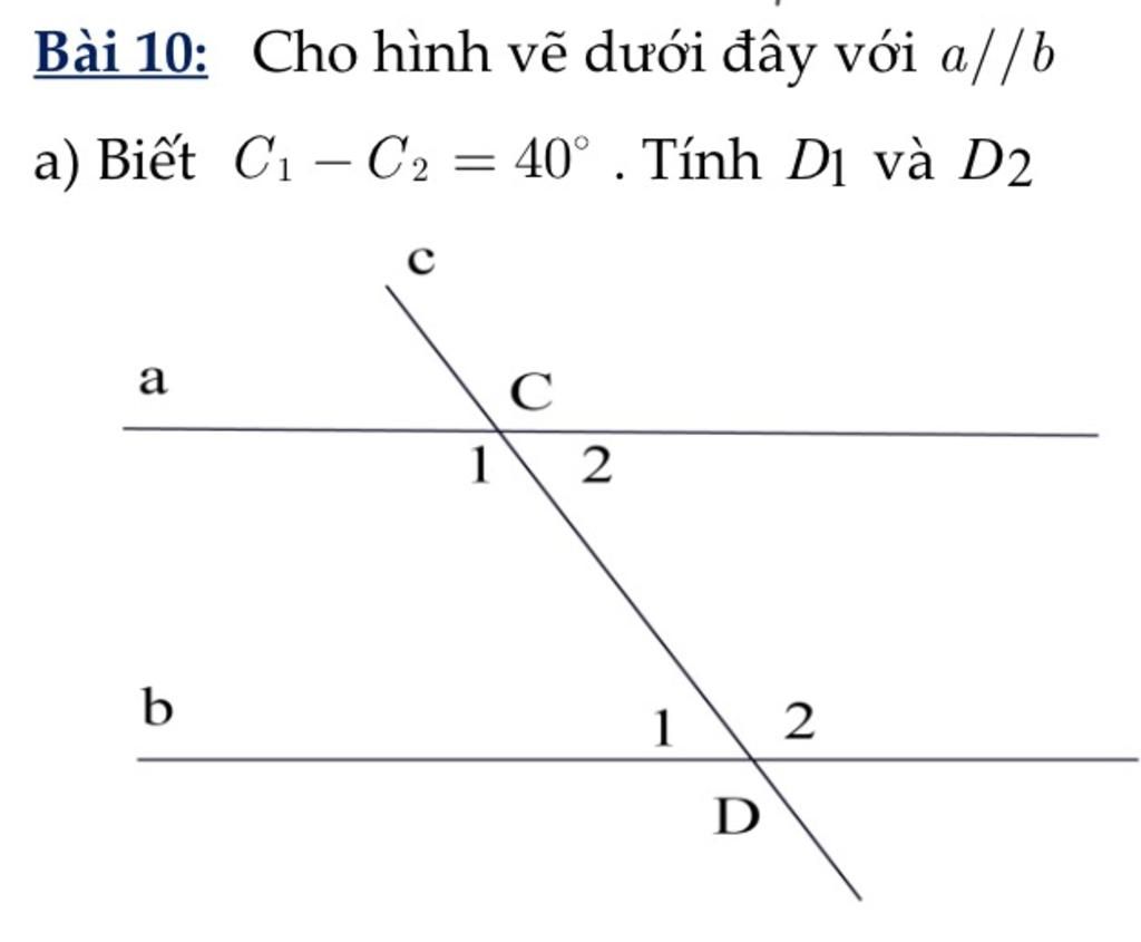 Ta có: `a////b(g t)` nên `{(\hatD_1=\hatC_2(so\ l e\ trong)),(\hatD_2=\hatC_1(so\ l e\ trong)):}`
