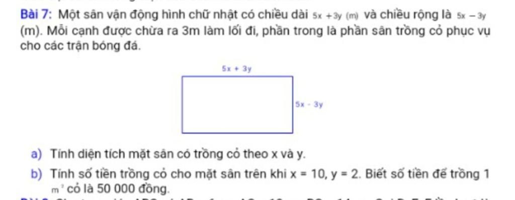 Chiều dài của sân trồng cỏ phục vụ cho các trận bóng đá là: `5x+3y-6(m)`