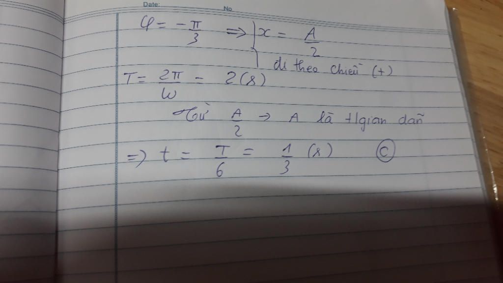 \Rightarrow t = \dfrac{\alpha }{\omega } = \dfrac{{\dfrac{{5\pi }}{6}}}{\pi } = \dfrac{5}{6}\left( s \right)