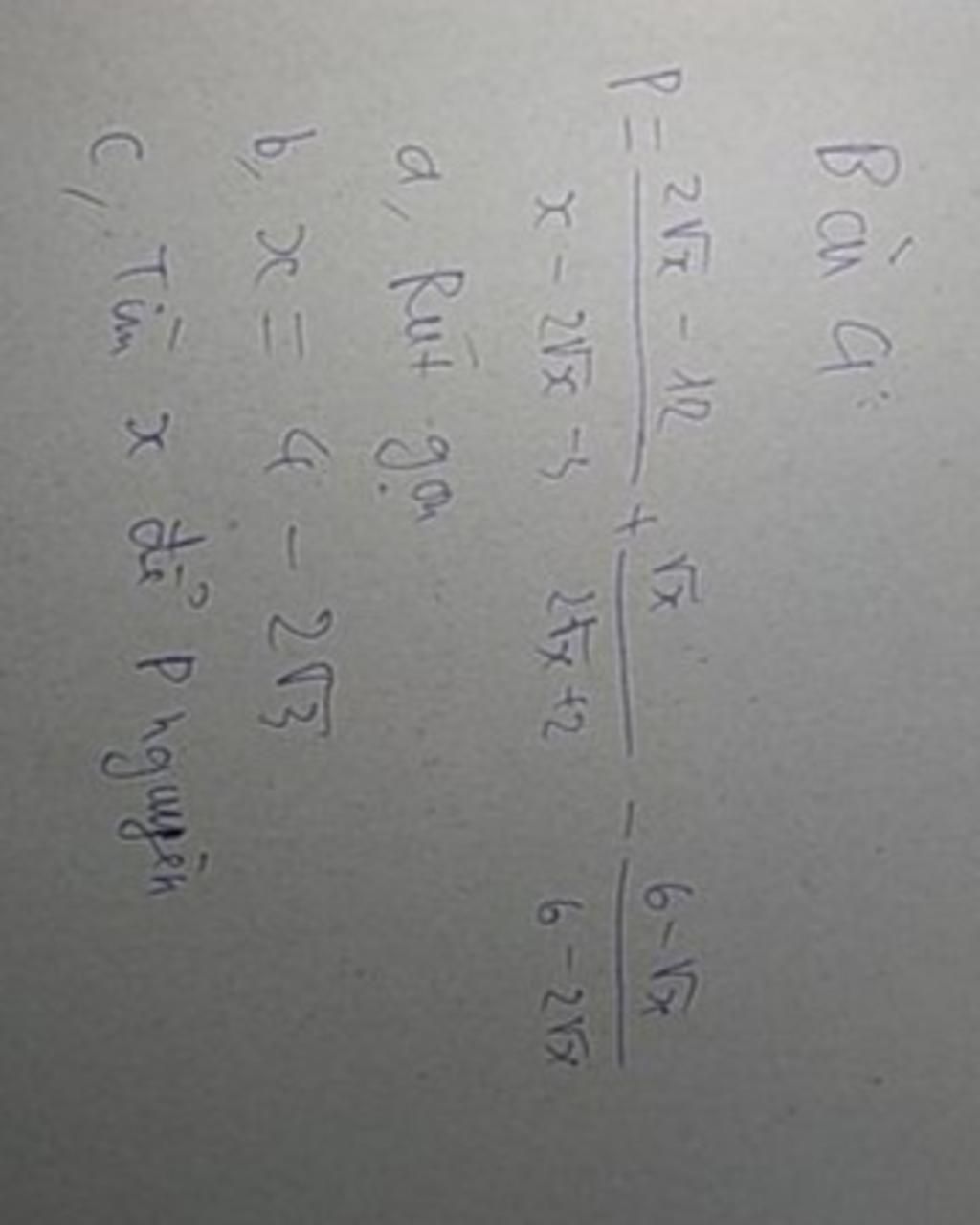 `\text{Vậy để P nguyên x = 4 hoặc x = 0}`