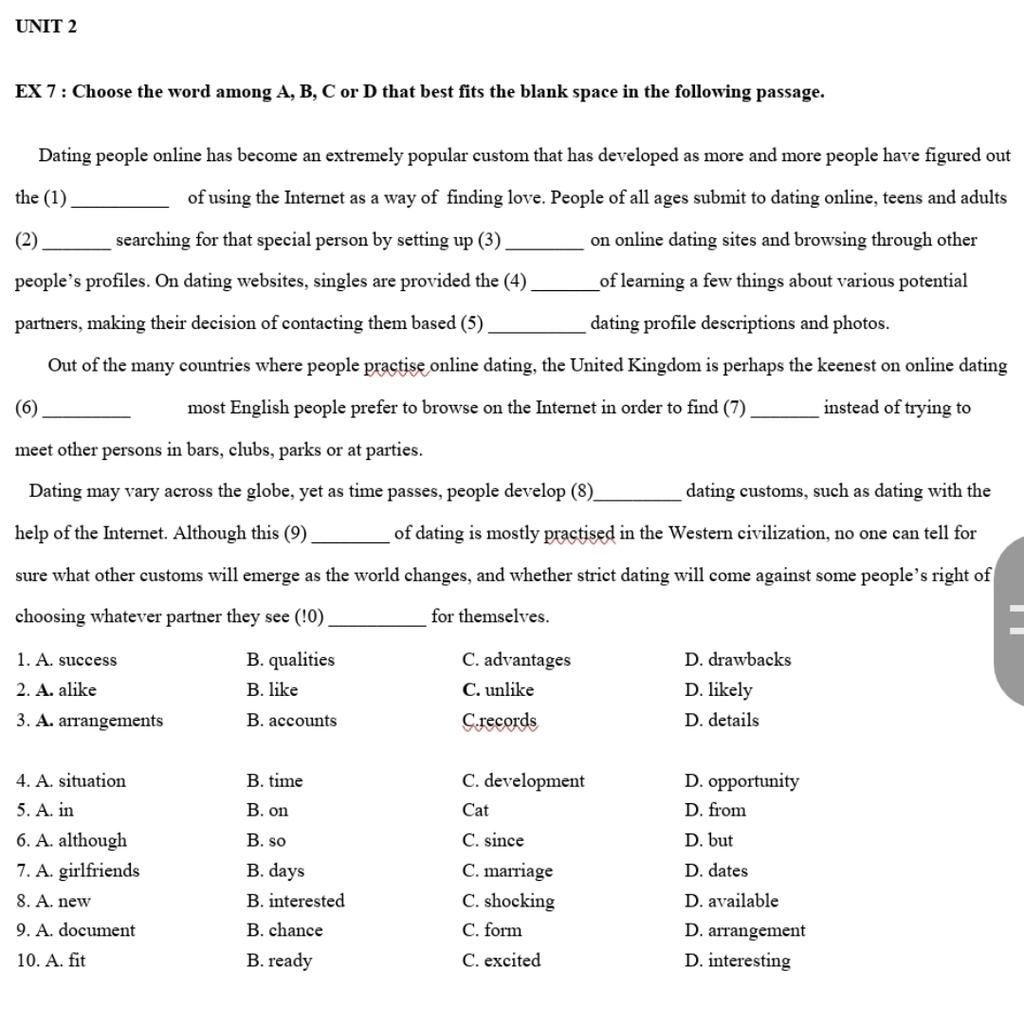 EX 7: Choose the word among A, B, C or D that best fits the blank space in the following passage.