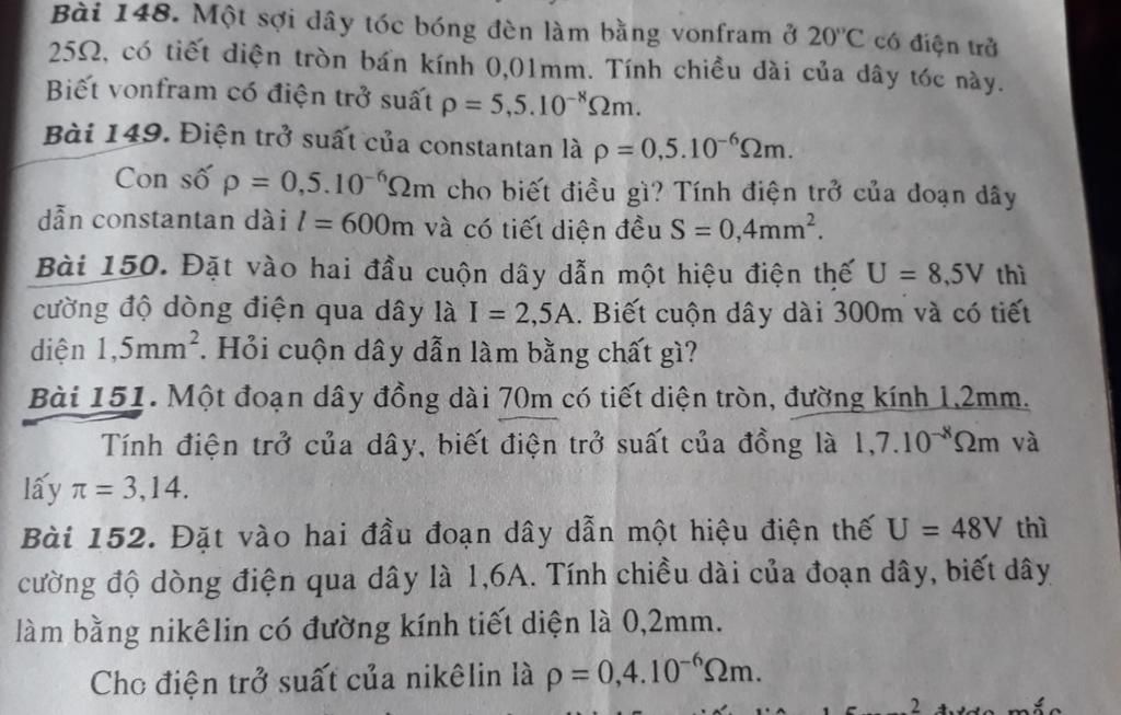 Con số `p=0,5.10^-6` cho biết cứ 1 mét dây dẫn constantan có tiết diện `1m^2` thì có điện trở là `0,5.10^-6 \Omega`
