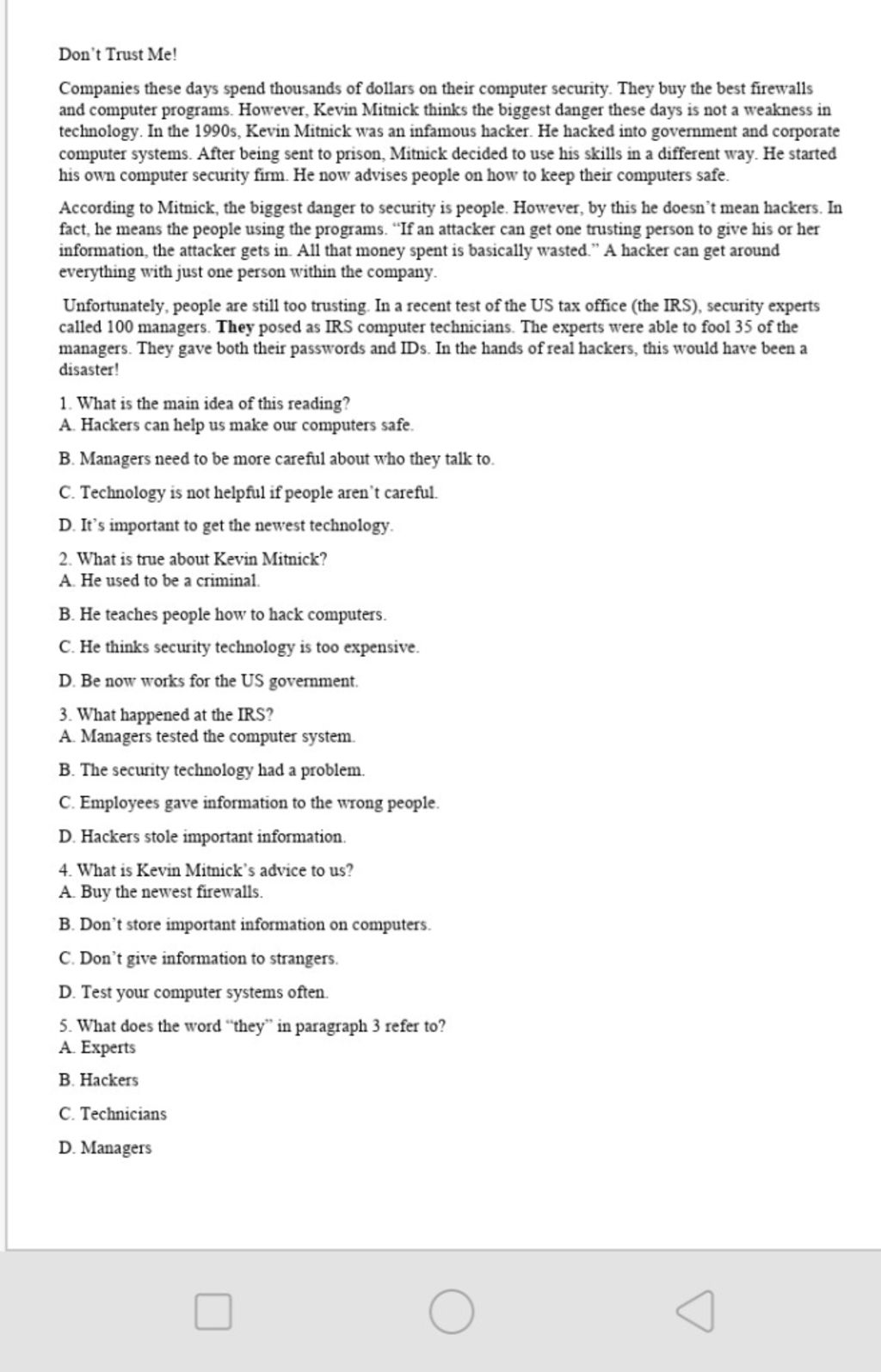 4. C (không đưa thông tin cho người lạ, đoạn 2, 3 là ví dụ)