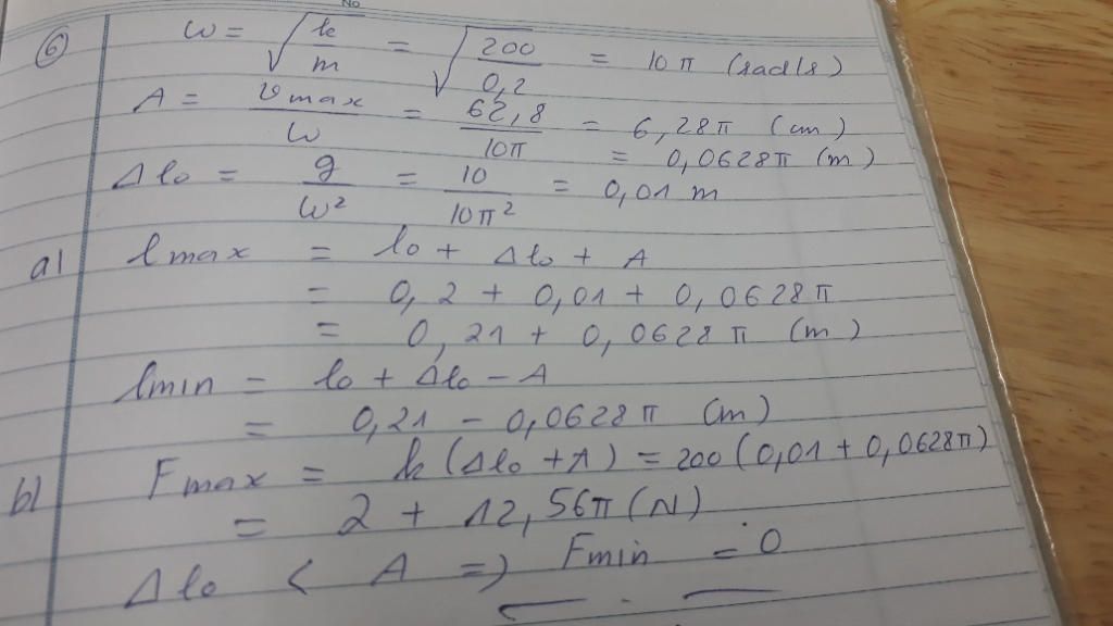 Một con lắc lò xo treo thẳng đứng, lò xo có chiều dài tự nhiên là 20cm, độ cứng k = 200N/m vật nặng có khối lượng 200g, vật dao động với vận tốc cực đại là 62,8 cm/s. Lấy g = π2 =10 m/s2 b. Tính chiều dài cực đại và cực tiểu của lò xo.Tính lực đàn hồi cực đại, cực tiểu của lò xo trong quá trình dao động.