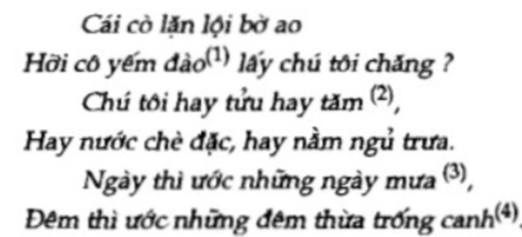 Câu ca dao cụ thể hoá sự lười biếng của nhân vật chú tôi thành những điều ước trái lẽ tự nhiên: Ngày thì ước những ngày mưa, Đêm thì ước những đêm thừa trống canh. Anh ta ước những ngày mưa để không phải đi làm và ước những đêm thừa trống canh để được tha hồ ngủ. Vậy là ngoài nghiện rượu, nghiện chè, chú tôi lại còn thêm nghiện… ngủ . Rõ là con người lắm thói hư tật xấu, rất đáng chê cười.