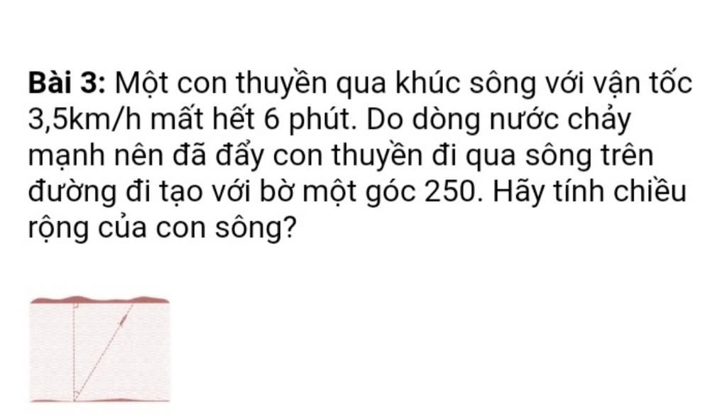 Chiều rộng sông $CA$, thuyền xuất phát từ $C$, đi qua sông theo quãng đường $CB, CB$ tạo với bờ $AB$ một góc $\widehat{B}=25^\circ$