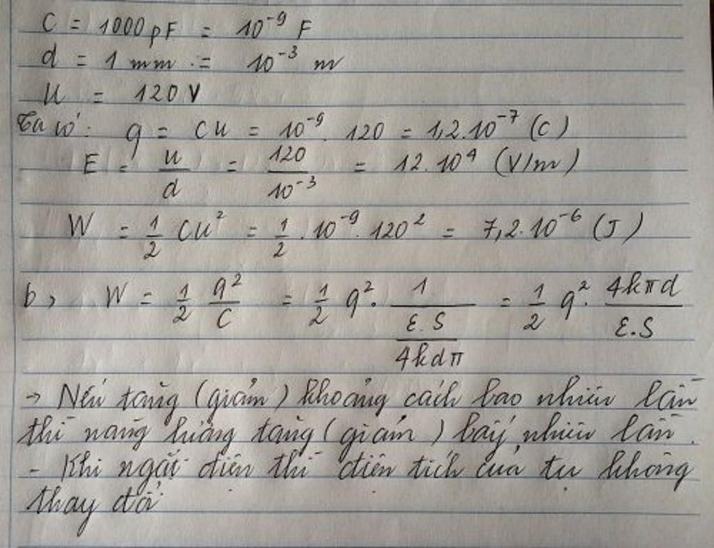 Bài 5. Một tụ điện không khí có điện dung 1000 pF và khoảng cách giữa hai bản tụ là d = 1mm. Tích điện cho tụ điện dưới hiệu điện thế 60V.